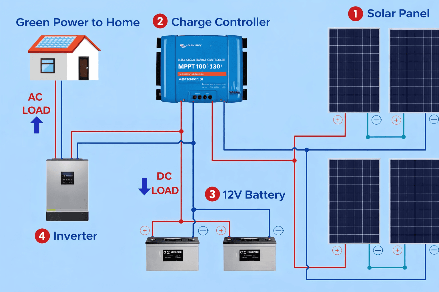 The battery bank is connected using dedicated DC cables. Most modern hybrid inverters include battery management systems, but correct voltage matching is still essential.